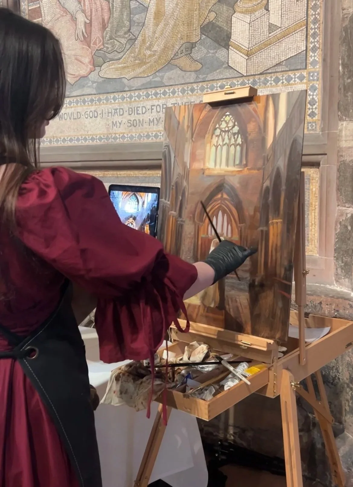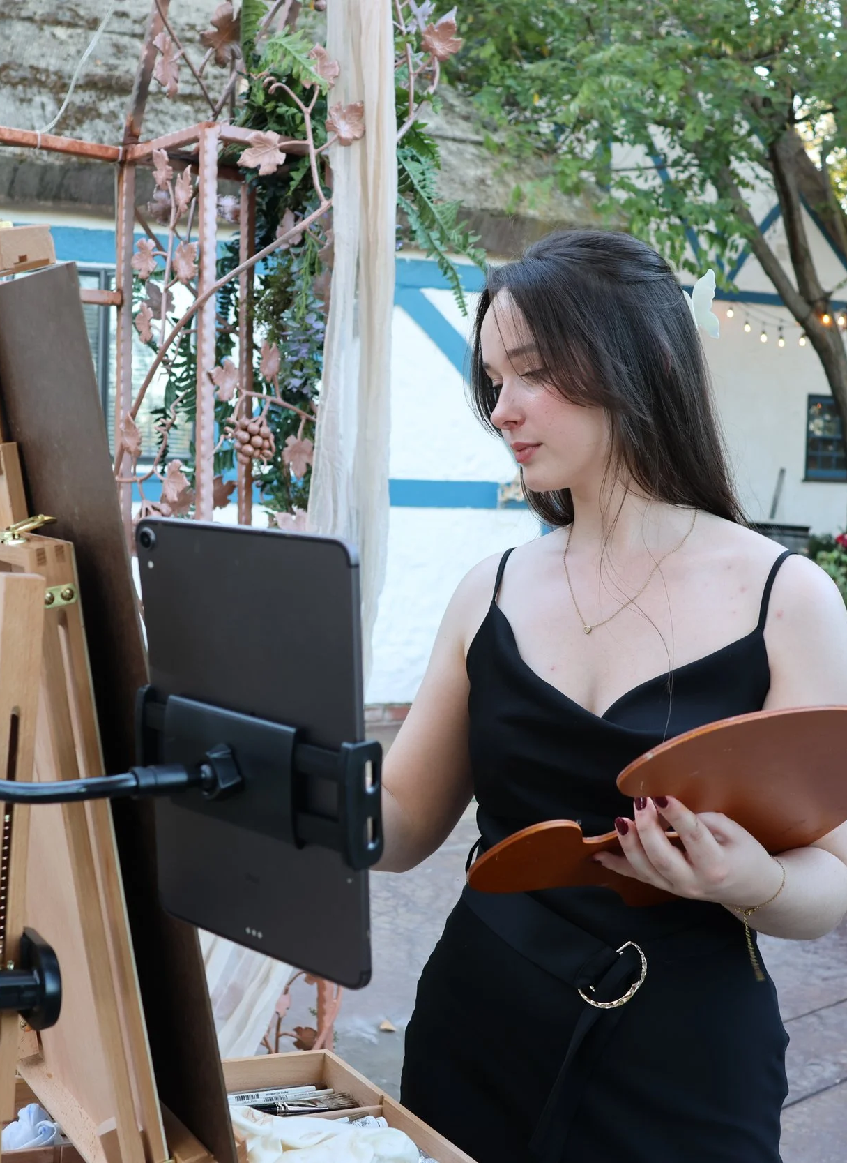 For whatever part of the wedding you decide that you want painting, I will arrive 1-2 hours before to set up my easel and start painting the background from life. In the key moments that you want to capture I will snap a few reference photos/videos to use later. I ensure to coordinate with you photographers/ videographers so that I don’t disrupt their shots.