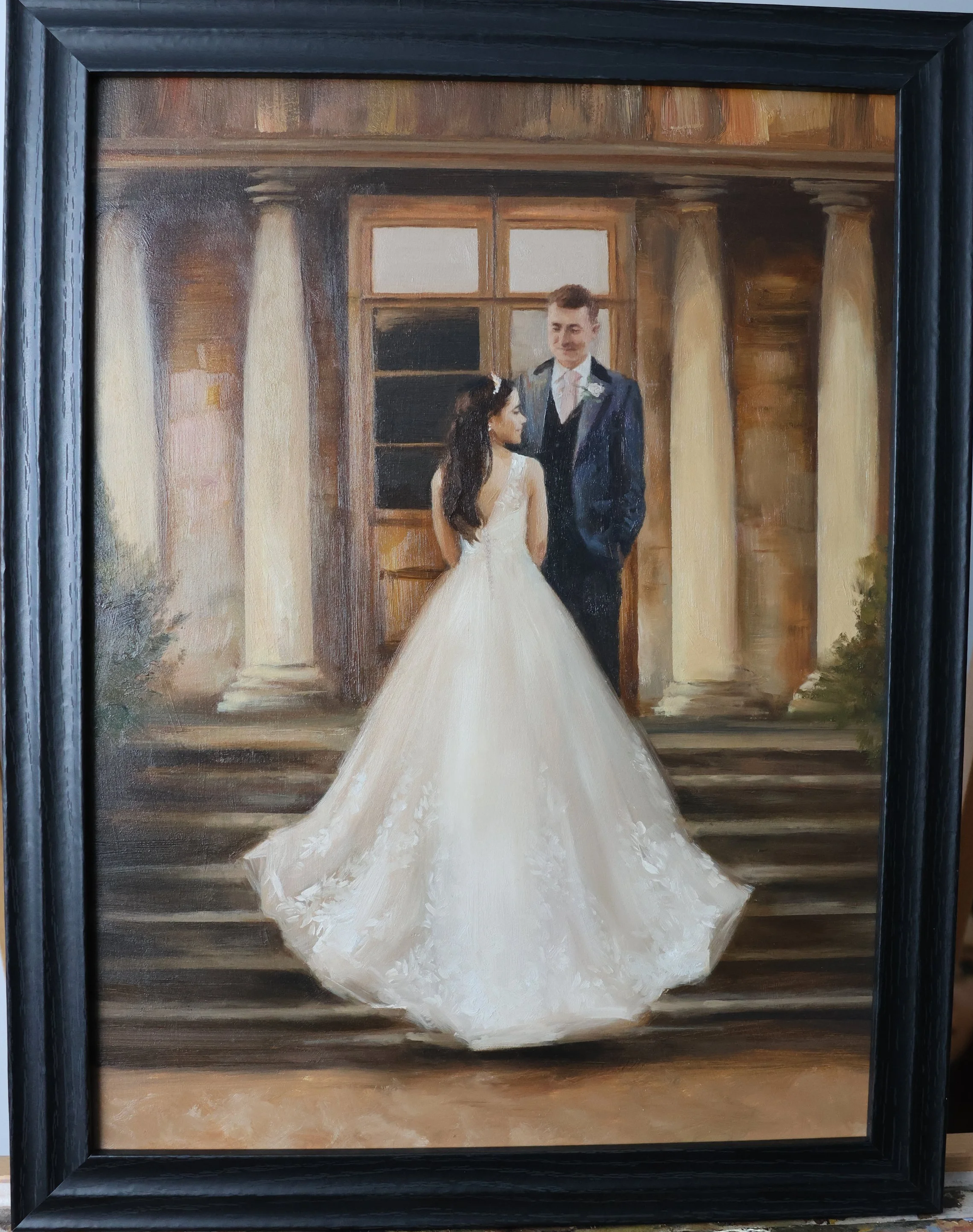 Roughly 8-10 weeks after the wedding. This gives me time to complete the painting in my studio after the wedding and gives the paint time to dry before varnishing. If there are any delays in the process then you will be notified.